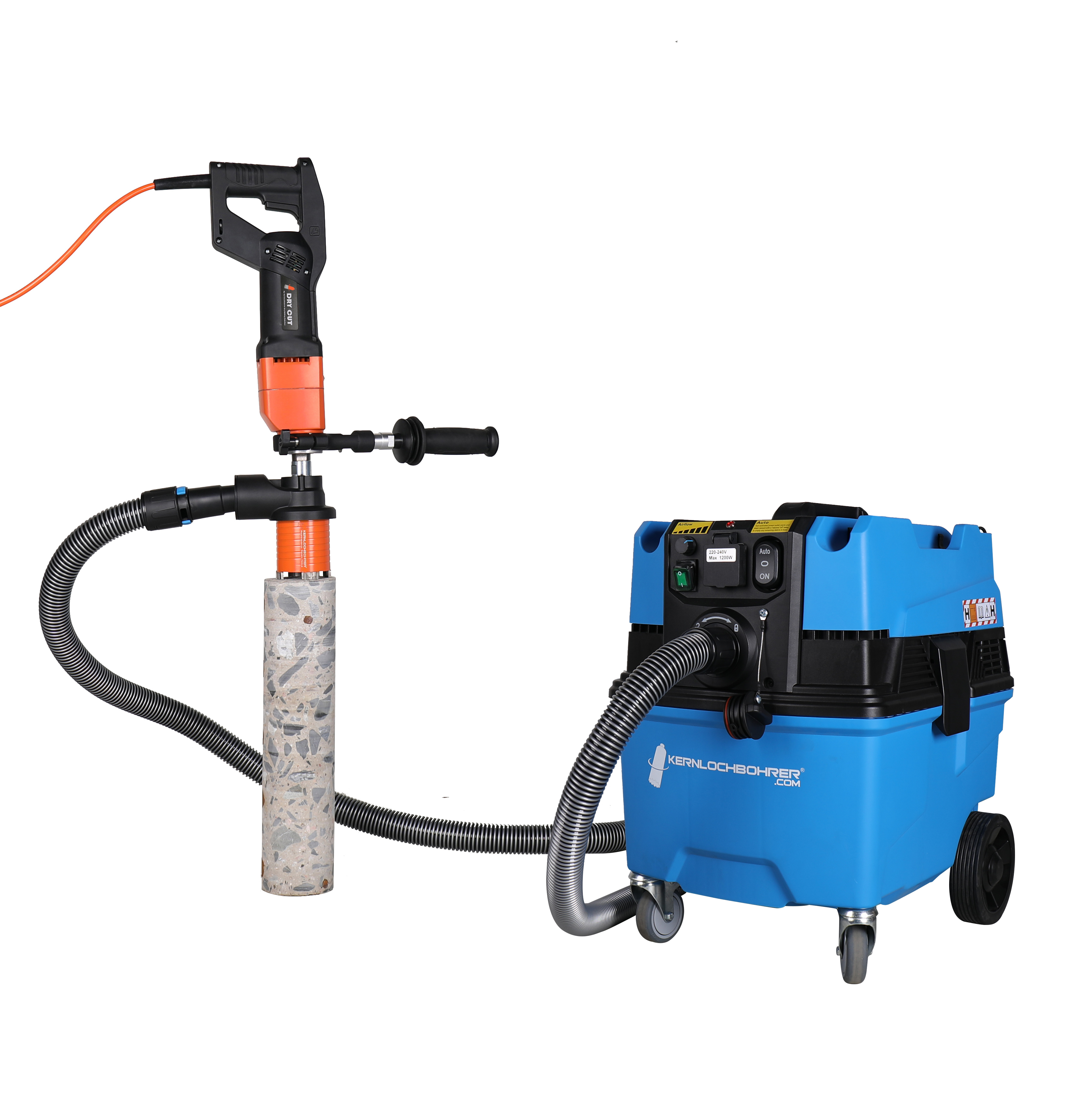 Für die Trockenbohrung bieten wir spezielle Maschinen mit Softschlagtechnologie. In Kombination mit einer geeigneten Bohrkrone für Softschlag und einem leistungsstarken Staubsauger bohren Sie damit effizient auch durch Stahlbeton – ganz ohne Wasser. Diese Technik ermöglicht staubarmes Arbeiten, besonders in Innenräumen oder sensiblen Umgebungen.